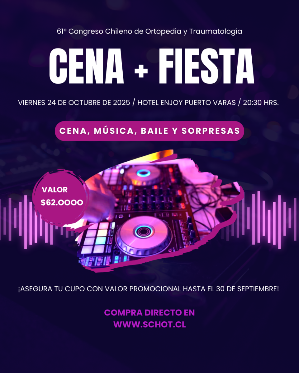 No te pierdas la actividad social de clausura del 61° Congreso Chileno de Ortopedia y Traumatología. El valor de la fiesta es de $62.000 y los tickets ya pueden ser comprados a través de este enlace.
